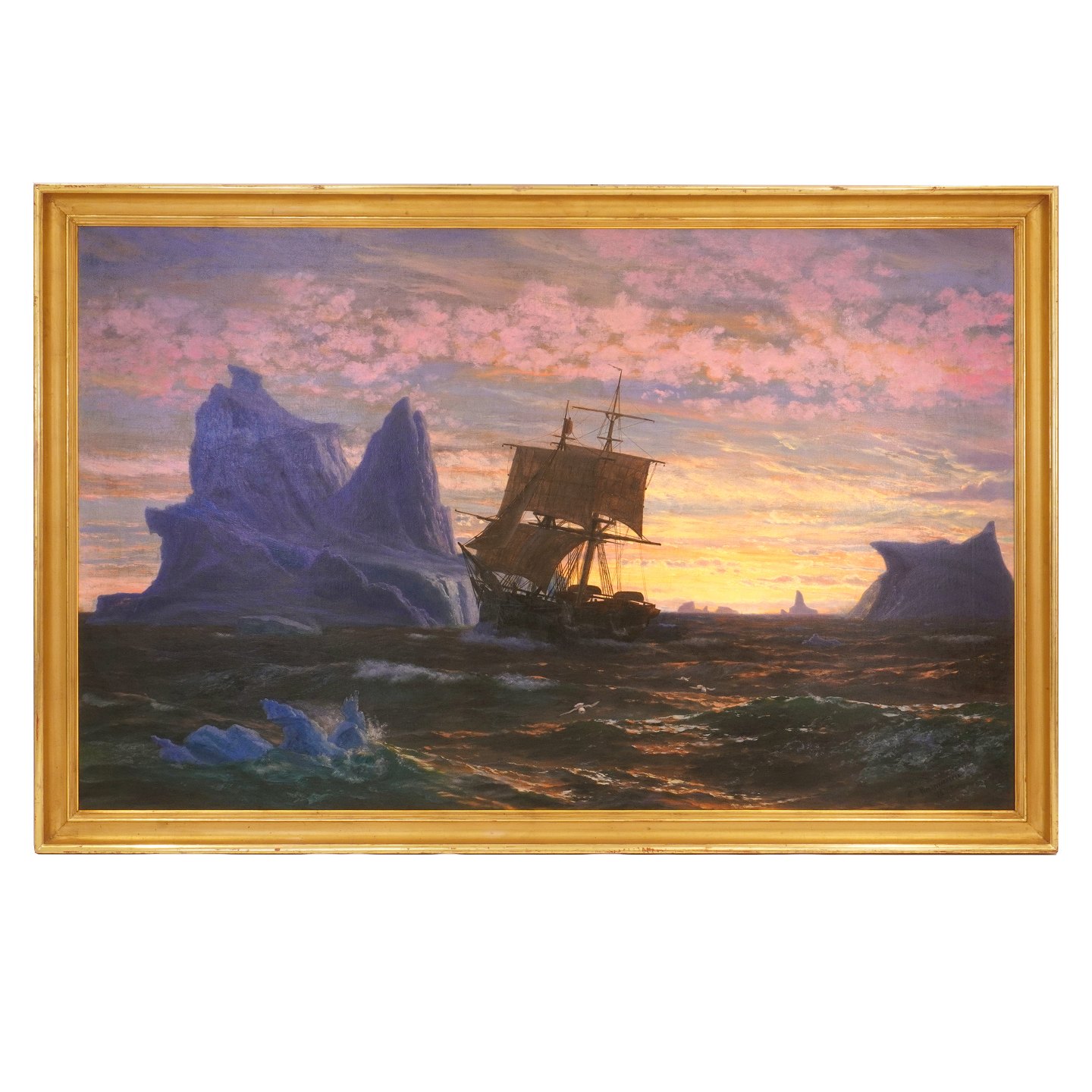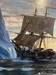 I E C Rasmussen parti fra Grønland med skib, isbjerge og solnedgang