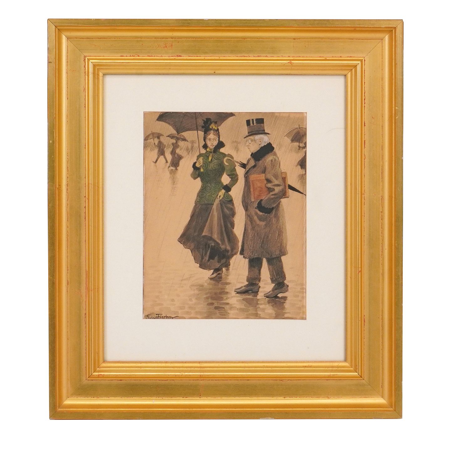 Paul Fischer akvarel. Paul Fischer, 1860-1934, Tusch og vandfarve. Spadserende par i regnvejr. Signeret Paul Fischer. Lysmål: 24x19cm. Med ramme: 46x41cm