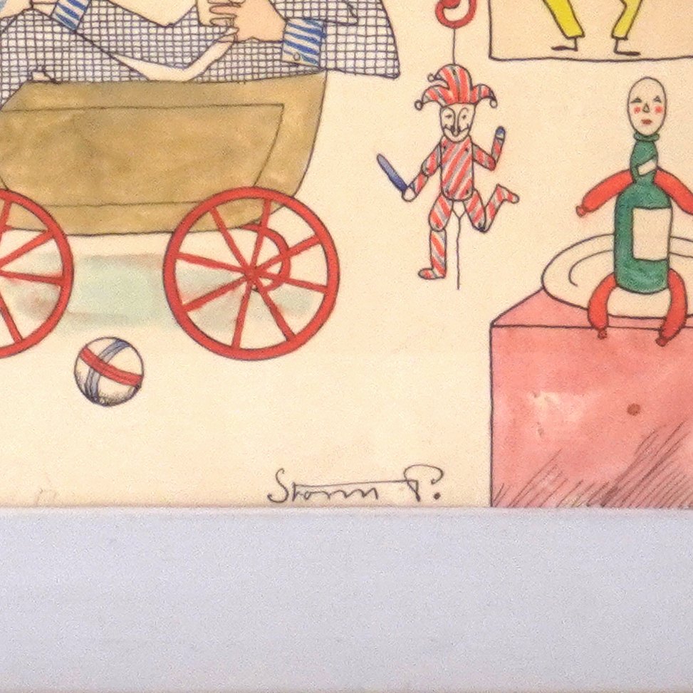 Storm P. akvarel. Robert Storm Petersen, 1882-1949, akvarel med temaet kunstudstilling. Signeret "Storm P." Lysmål: 30x47cm. Med ramme: 44x59cm