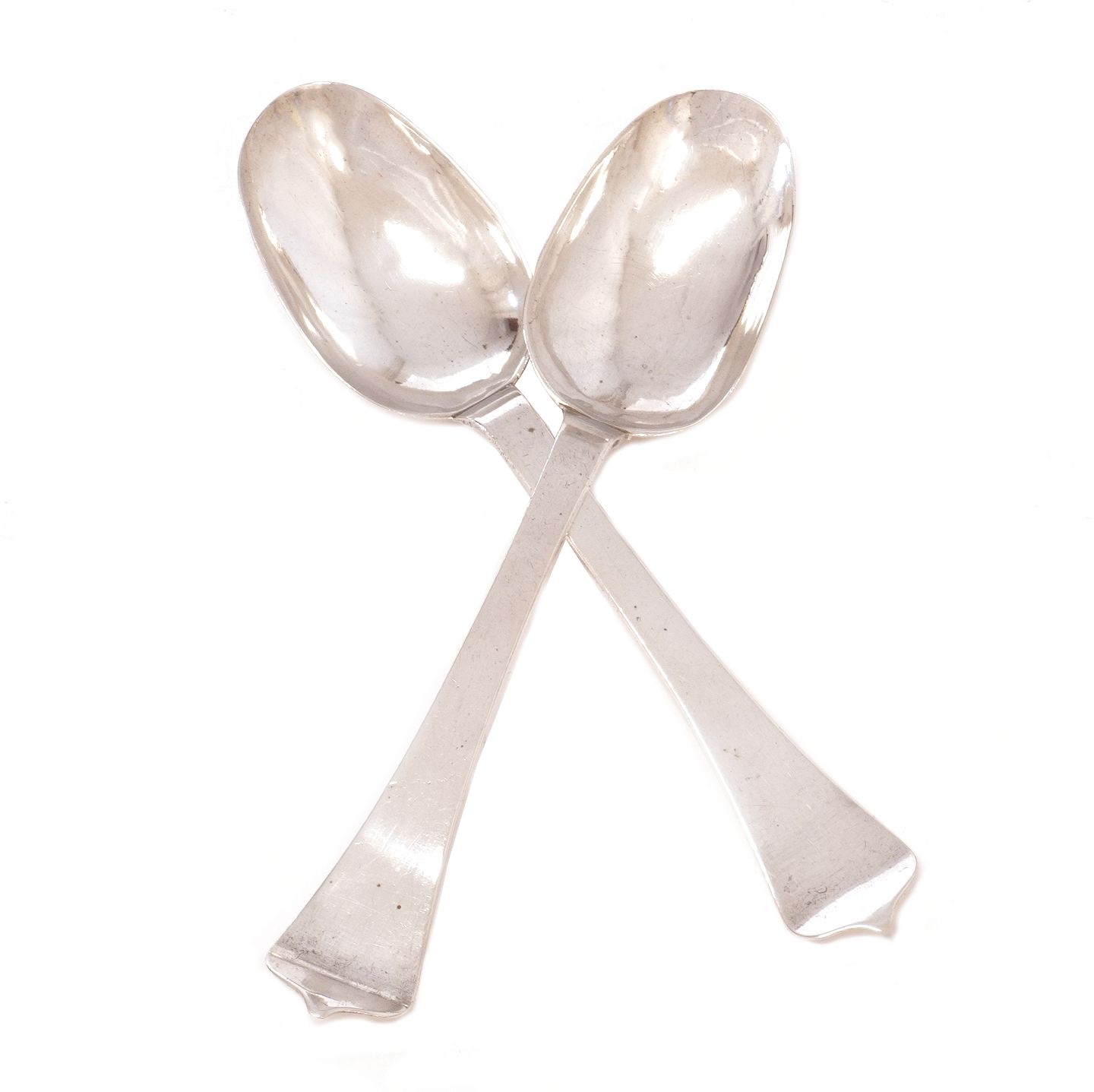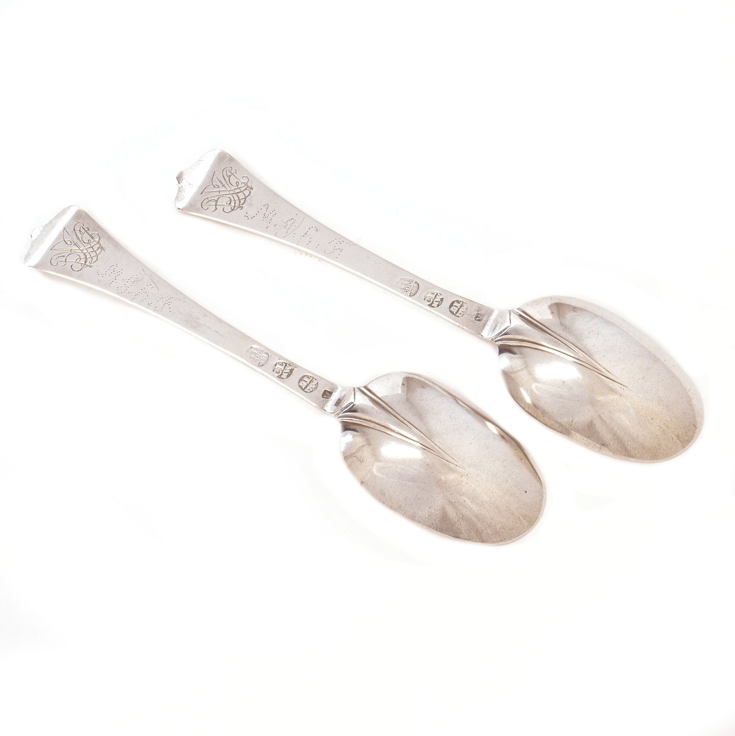 Et par rottehale sølvskeer af Bendix Aagesen Lund, København, 1695-28, dateret 1719. L: 19,2cm