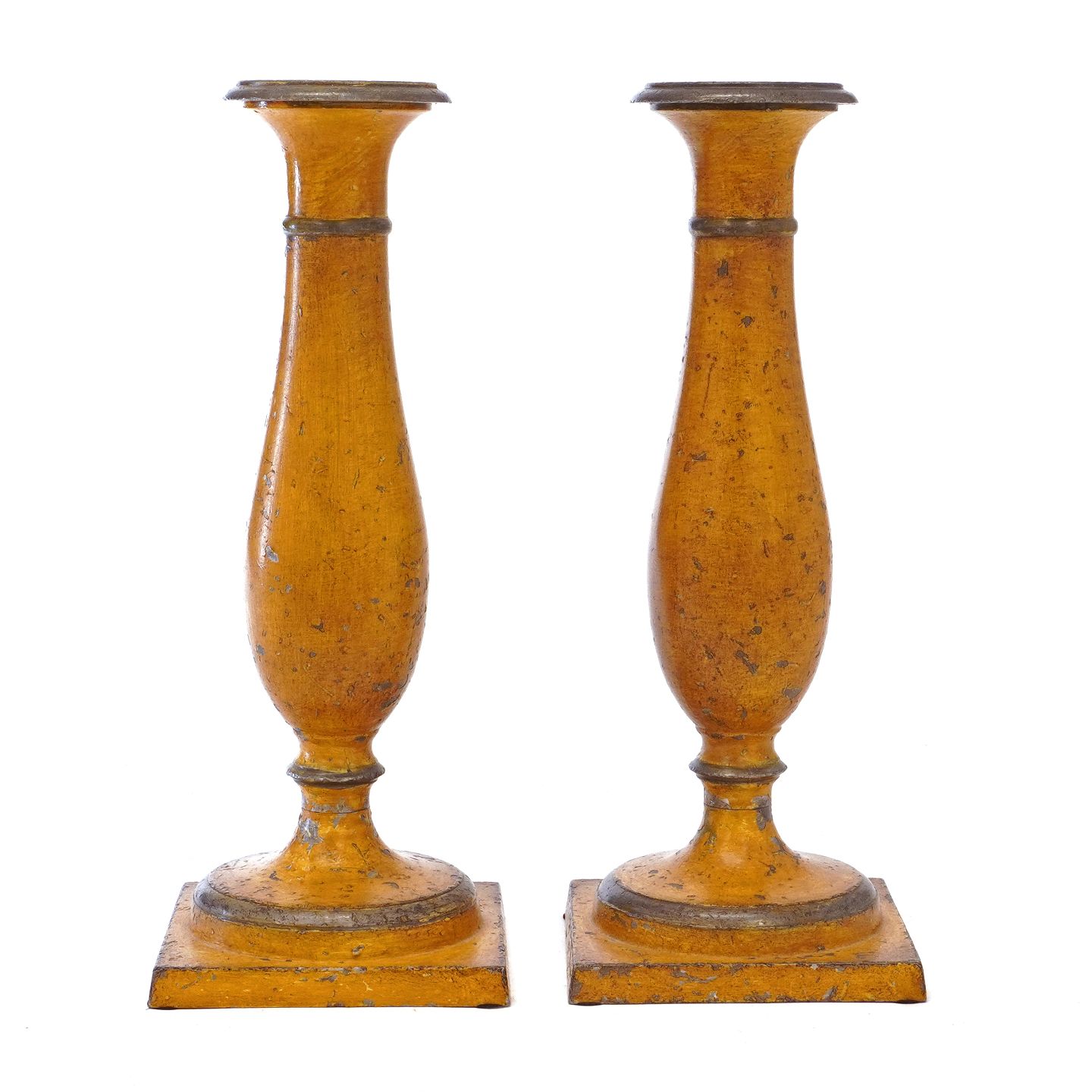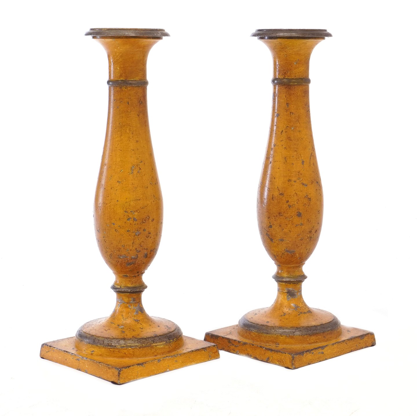 Pair of Danish mid 19th century yellow decorated pewter candlesticks