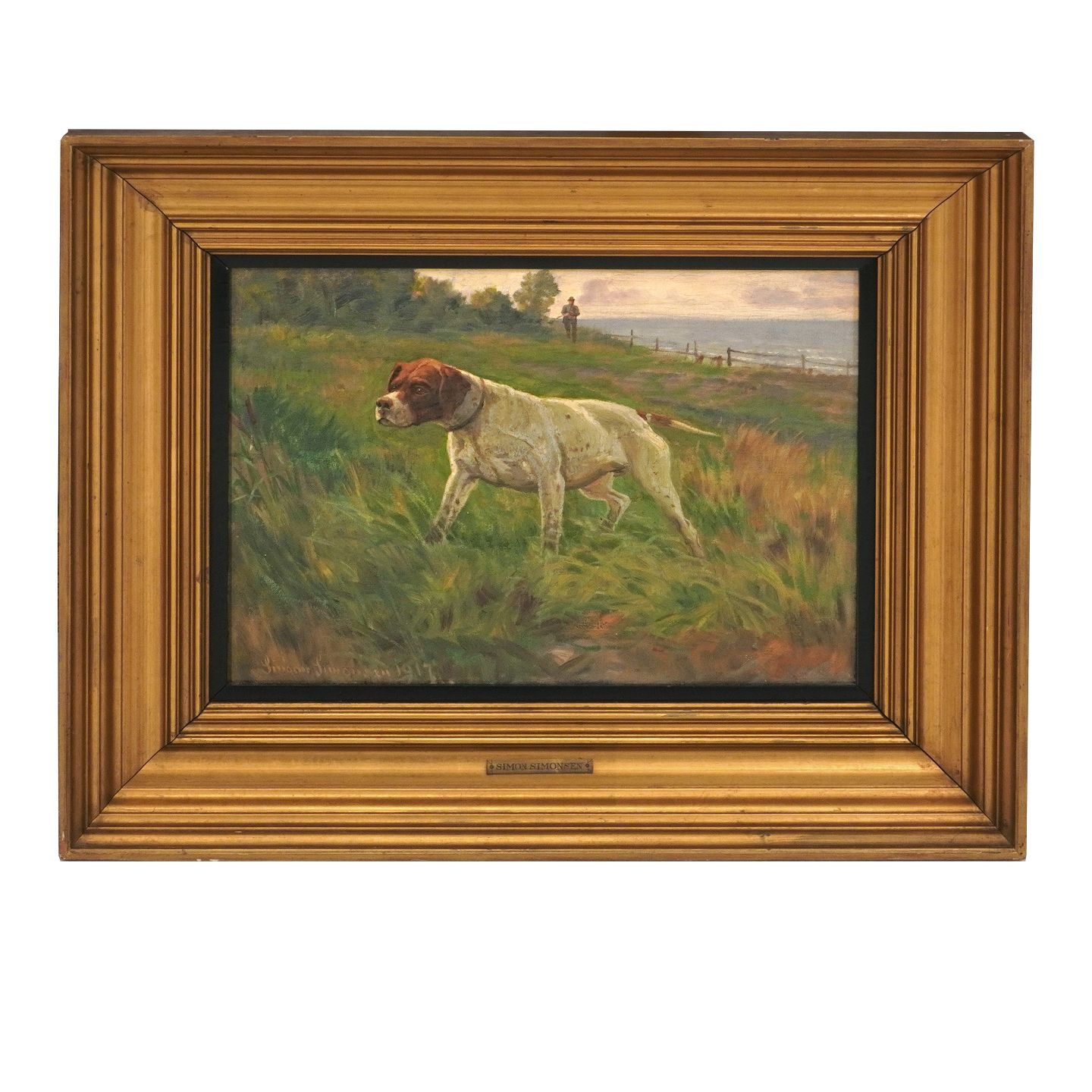 Simon Simonsen, 1841-1928, Öl auf Leinen. Pointer mit Jäger. Signiert und datiert 1917. Lichtmasse: 23x32cm. Mit Rahmen: 39x48cm
