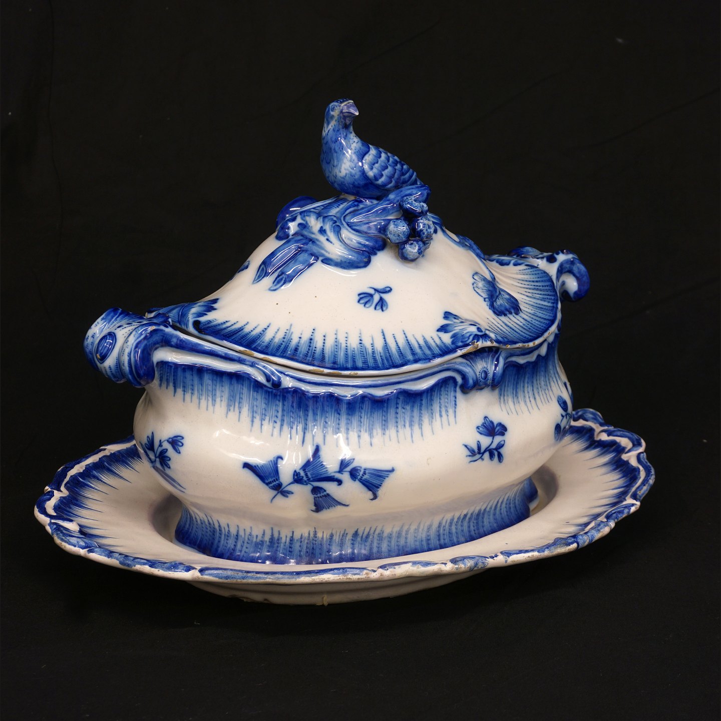 Blådekoreret terrin af fajance med underfad. Signeret Marieberg, Sverige, 02.08.1766. H: 27cm. L: 45cm