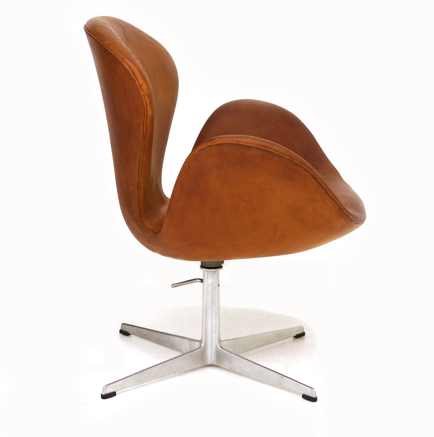 Arne Jacobsen: "Svanen" betrukket med patineret cognacfarvet skind. Højdejusterbart aluminiumsstel med fire fødder. Produceret af Fritz Hansen. Toppen af ryggen med kraftigere patinering