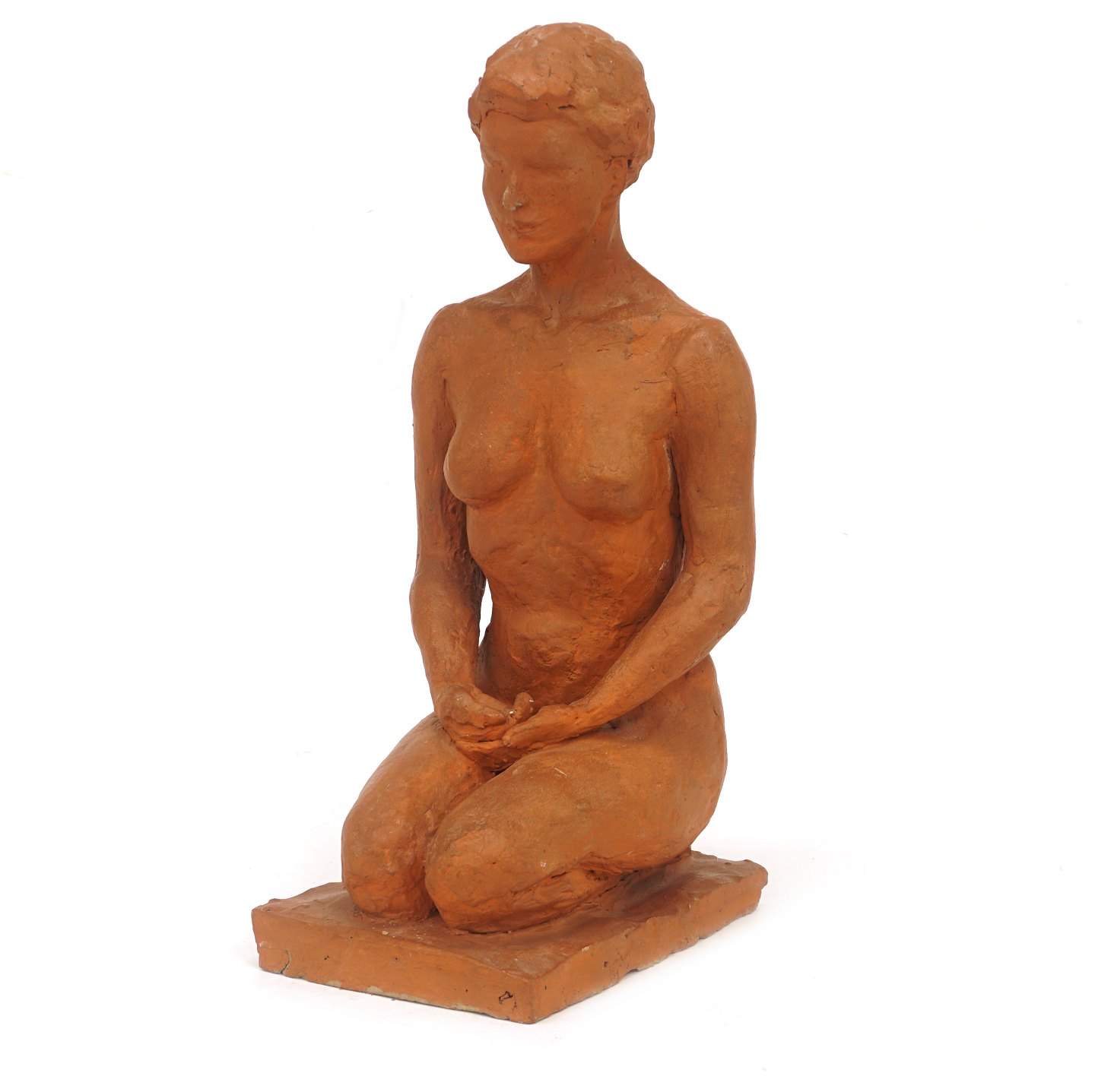Skulptur af knælende kvinde modelleret i ler. H: 40cm. B: 14cm. L: 22cm