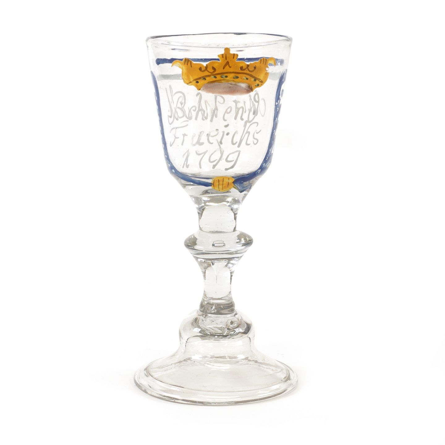 Bøhmisk glas med emaljedekoration. Med inskription "Behrend Frueichs 1799" og "Mir wohl". H: 15cm