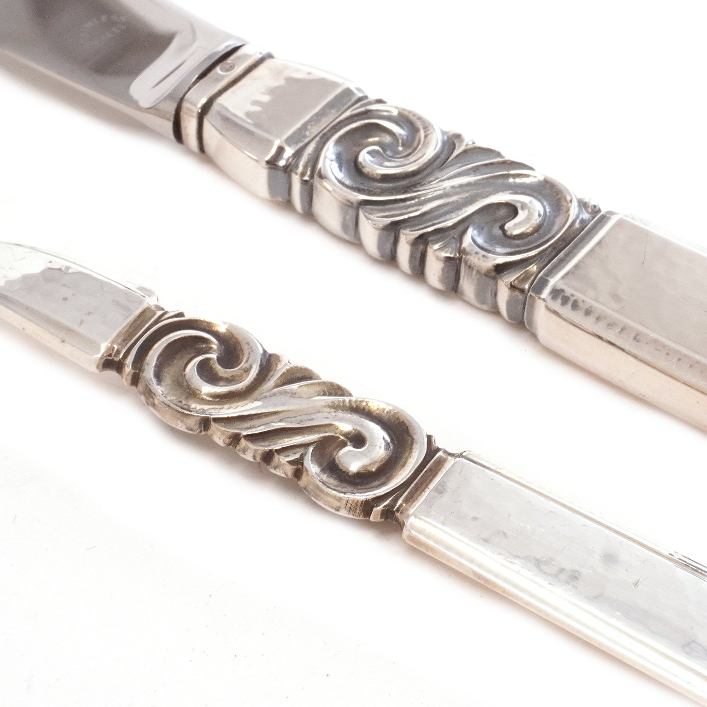 Johan Rohde for Georg Jensen Saga sterling sølv bestik bestående af seks frokostknive (L: 19,5cm), seks spisegafler (L: 18cm) og seks dessertskeer (L: 17cm)