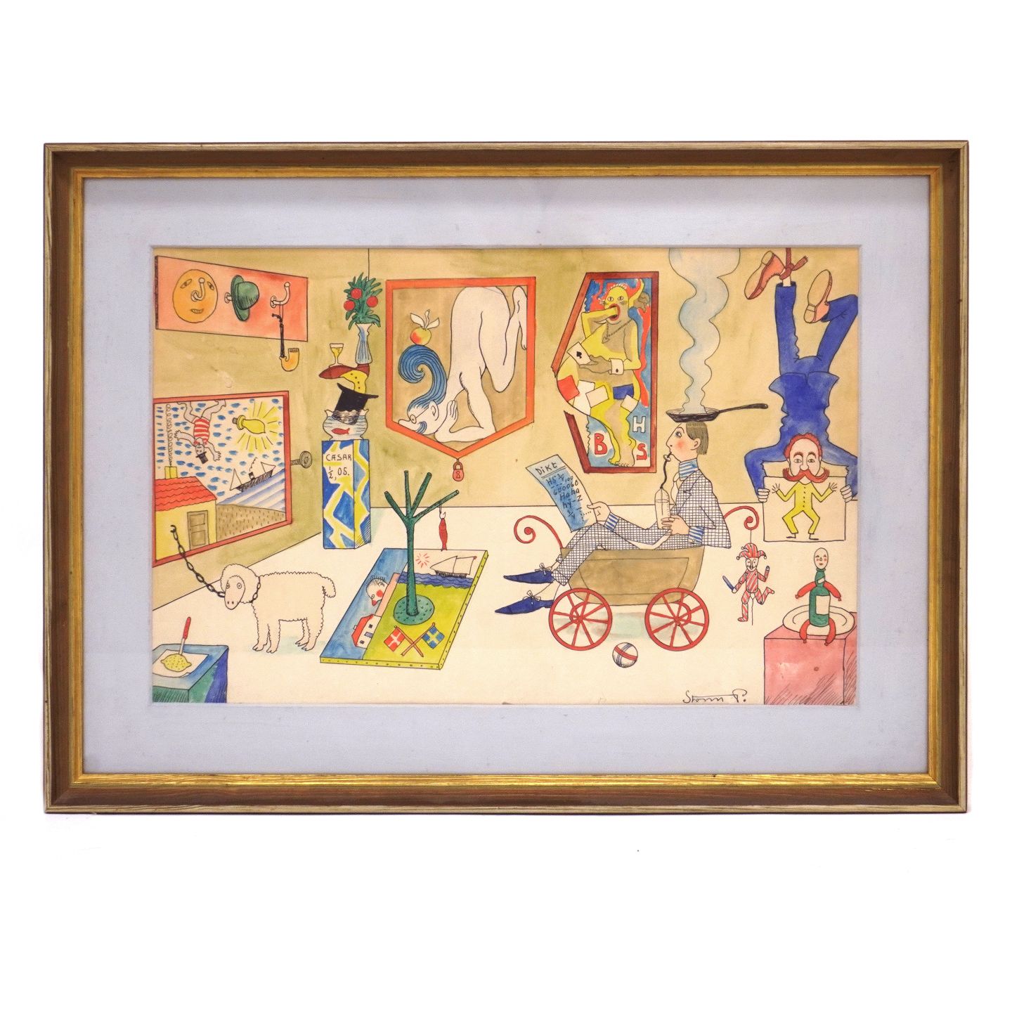 Storm P. akvarel. Robert Storm Petersen, 1882-1949, akvarel med temaet kunstudstilling. Signeret "Storm P." Lysmål: 30x47cm. Med ramme: 44x59cm