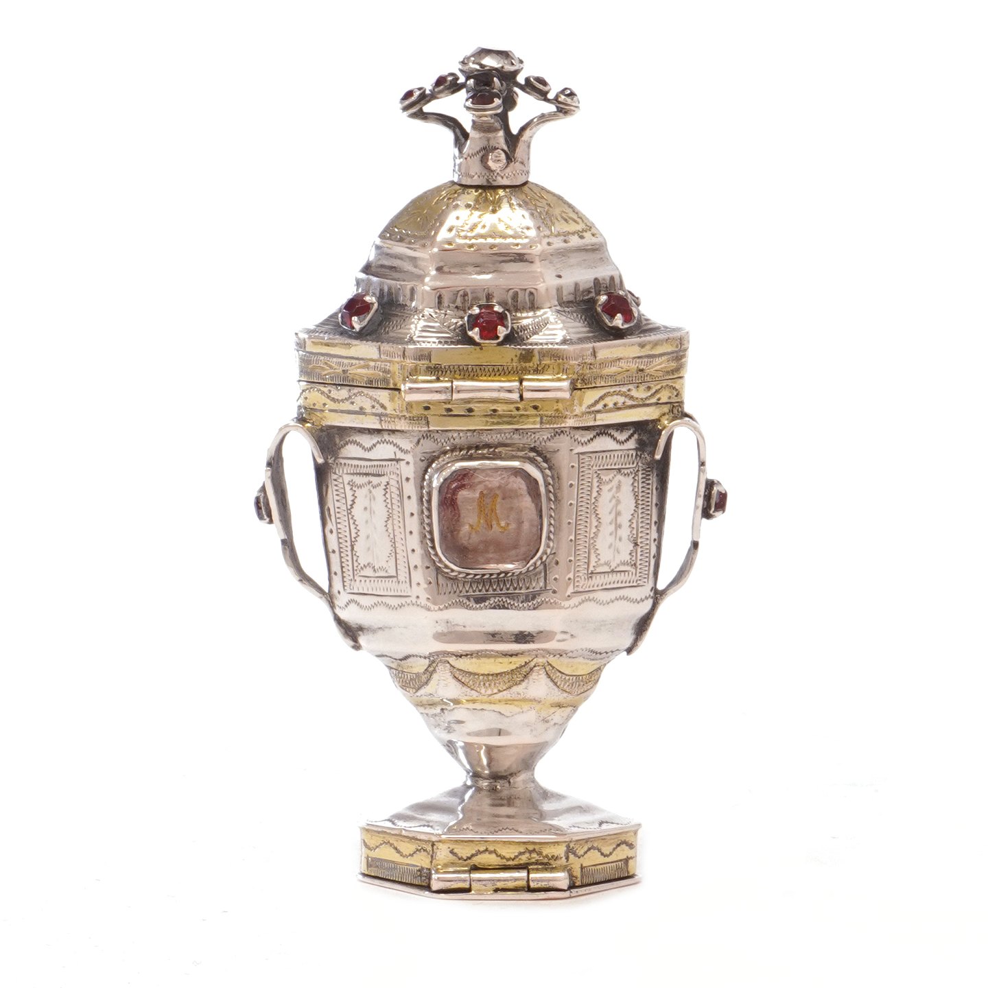 Hovedvandsæg i delvist forgyldt sølv udført af Martin Petersen Hommelhoff, Tønder, ca. år 1820. H: 9,5cm